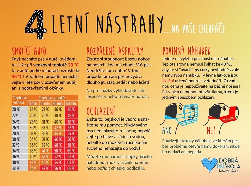PONECHÁNÍ V AUTĚ ZA TEPLÉHO POČASÍ – nikdy nenechávejte vašeho pejska za teplejších dní zavřeného v autě. V autě je několikanásobně vyšší teplota než venku a nepomůžou ani pootevřená okýnka, auto se velmi rychle vyhřeje a pejskovi může hrozit velmi bolestivá smrt již během několika minut.
